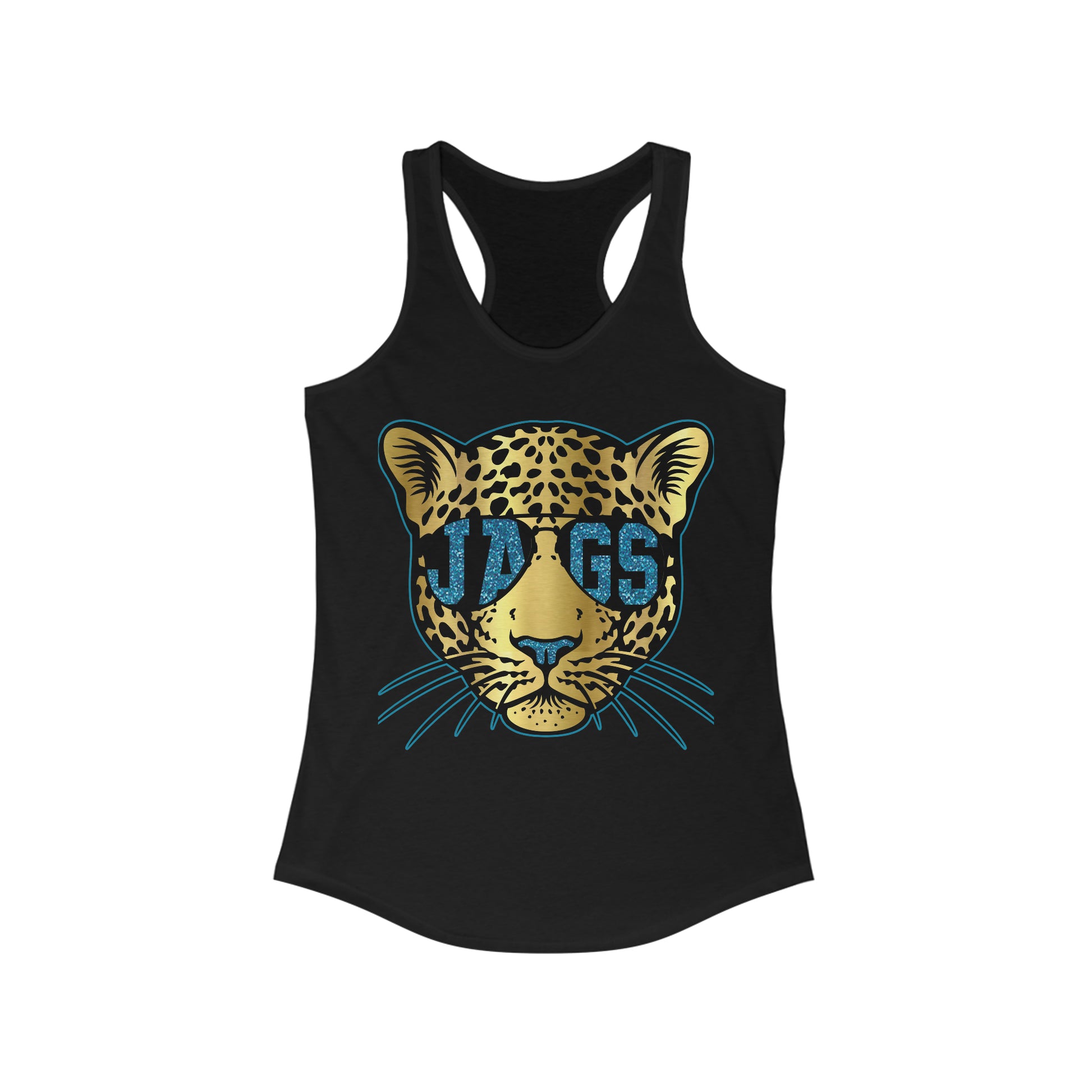 A high-quality print of a playful metallic gold jaguar wearing sunglasses proudly shimmering with teal glitter letters spelling "Jags" in their reflection. This slim fit, racerback tank-top will turn heads at the next game or tailgate!