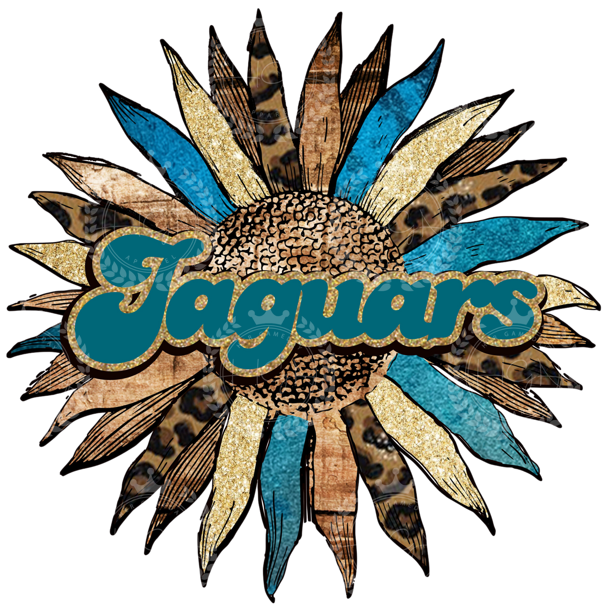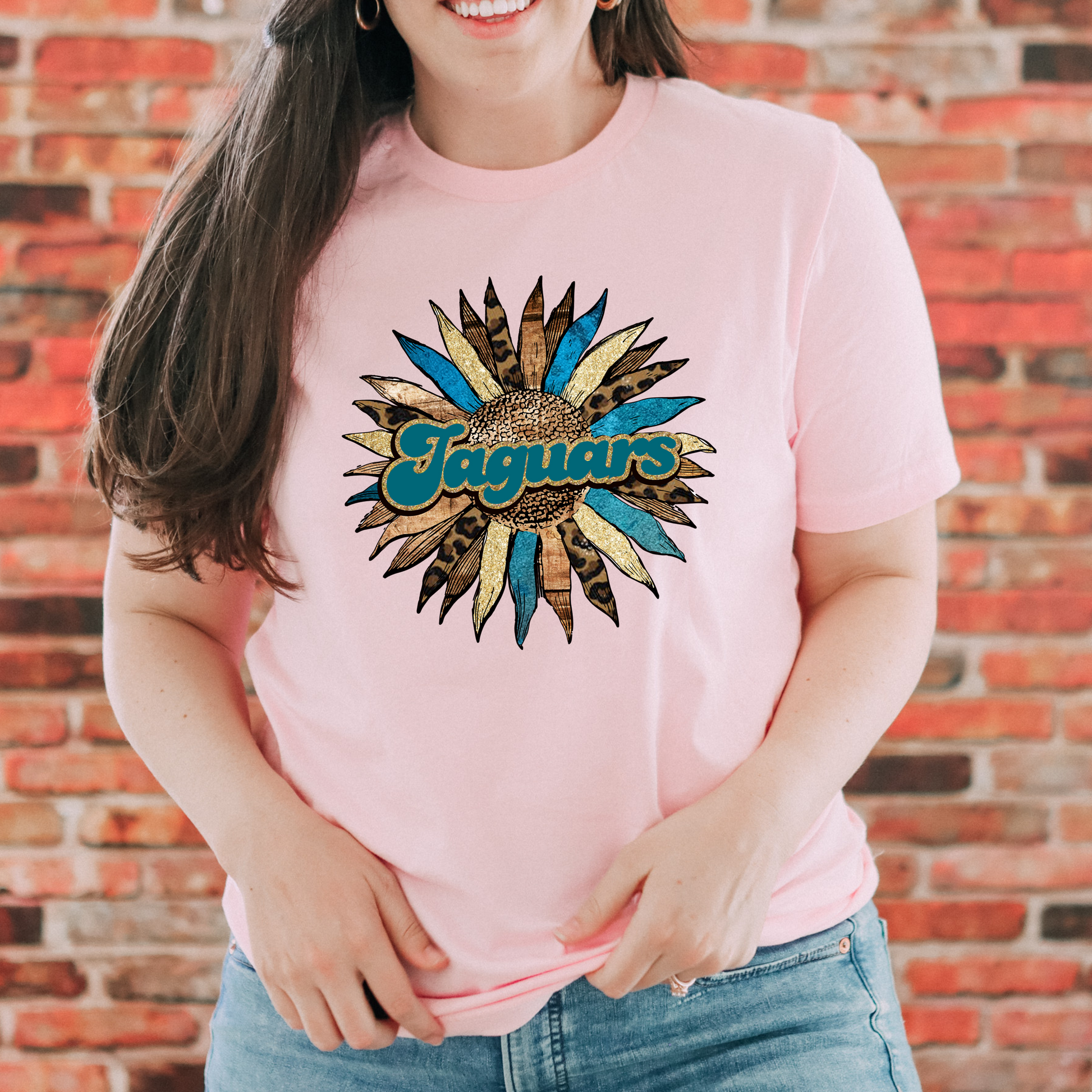 Jaguars Boho Sunflower Glitter, Teal & Leopard Print, Jacksonville Jaguars Inspired Women's Football Short Sleeve T-shirt